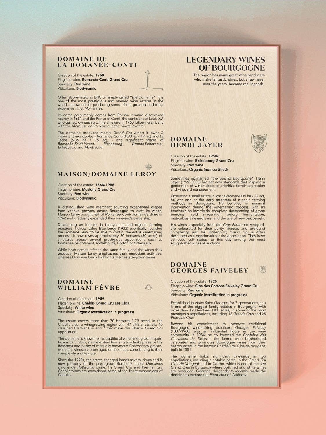 Explore Bourgogne, a region renowned for its rich wine history and lasting influence on global viticulture. This experience is designed to deepen your appreciation for Bourgogne’s vinous heritage and enhance your understanding of its intricate wine culture and appellation system. Included on the box: - A detailed map of the Côte d’Or - A guide to Bourgogne wine labels - Insights into wine styles and grape varieties - Profiles of some of Bourgogne’s top domaines Illustrations by Nikita Fabbro. Made in USA