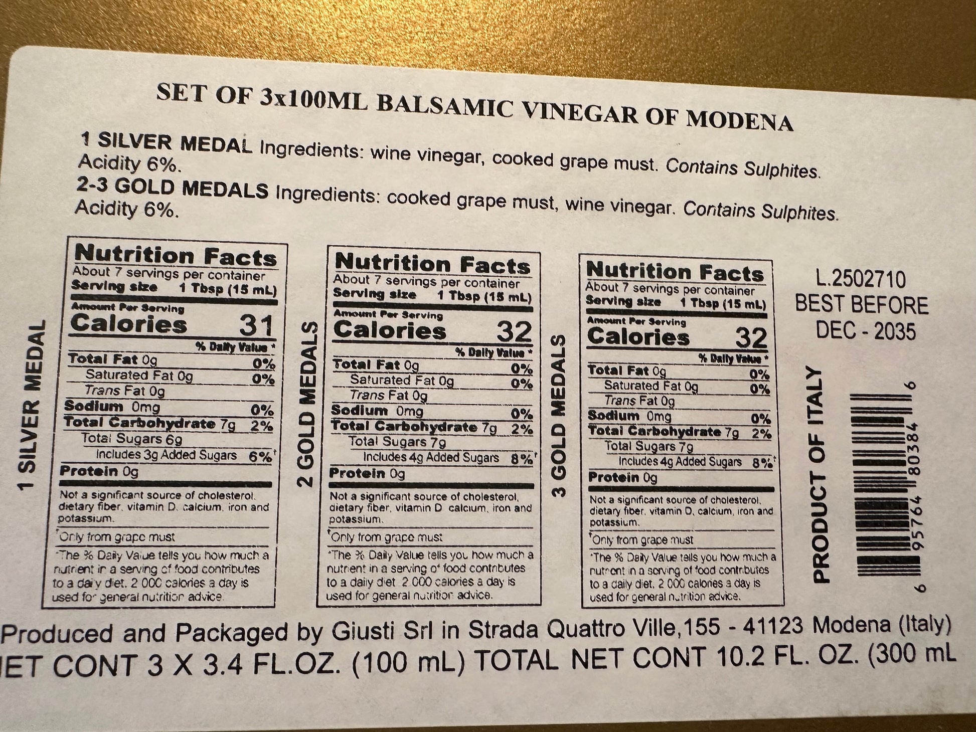 1 Silver Medal (Medaglia d'Argento) – A highly aromatic balsamic that enhances dishes with its intensity, created with the addition of balsamic vinegar from centuries-old casks and refined in French oak barrels from the 1900s.