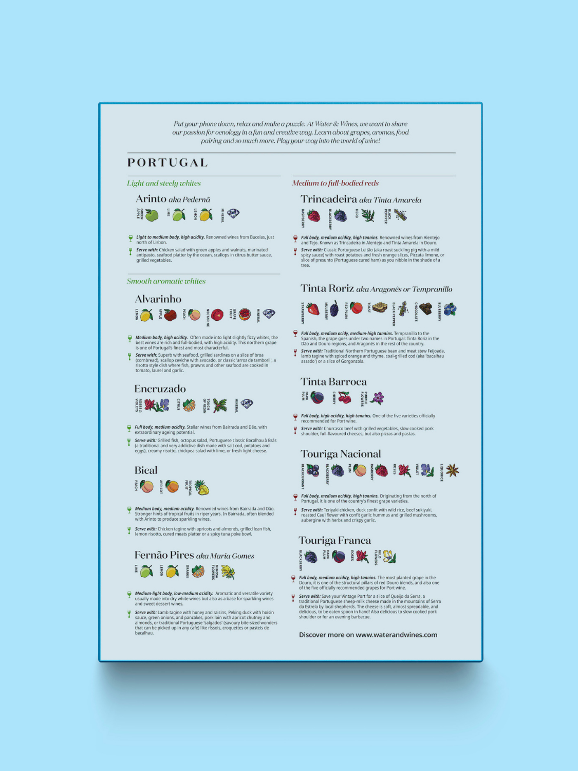 Discover the richness and diversity of Portuguese wine culture with our artfully illustrated jigsaw puzzle. The country is most famous for Port and Madeira wine, but it has so much more to offer with an incredible diversity of indigenous grape varieties. Our puzzle takes you through the country's key wine-producing regions, main grape varieties, and star appellations, curated by expert sommeliers for an educational and immersive experience perfect for wine enthusiasts and novices alike.