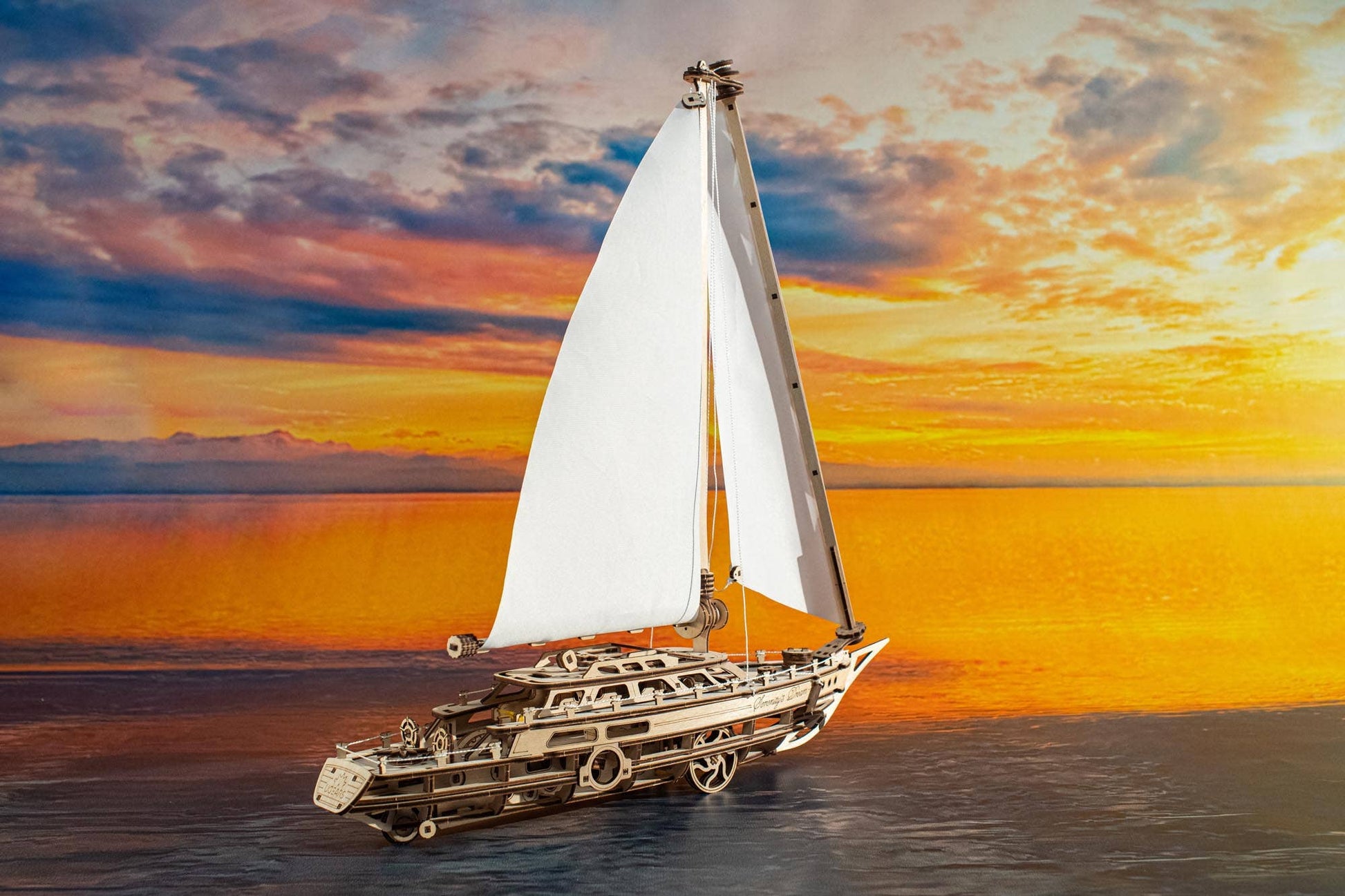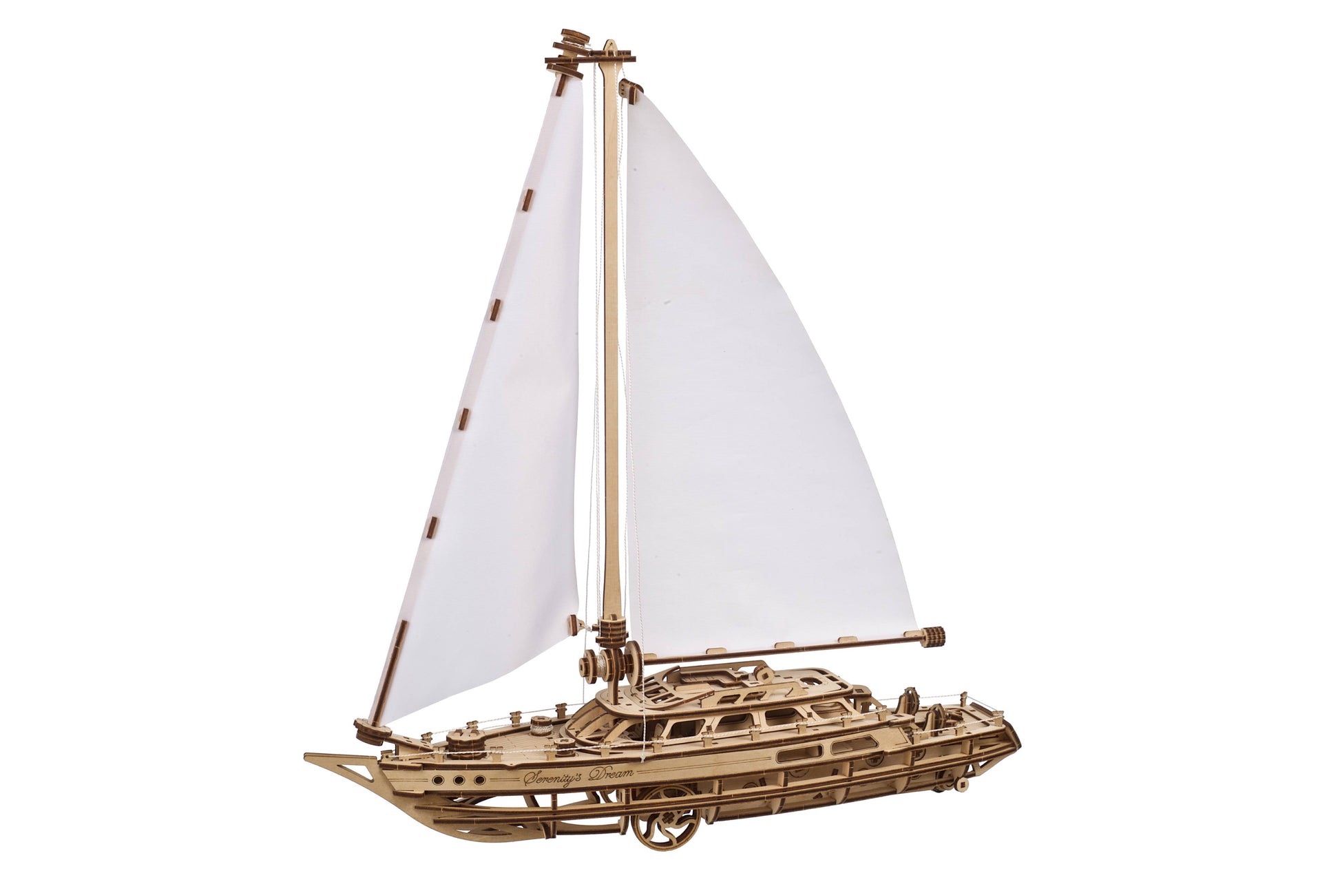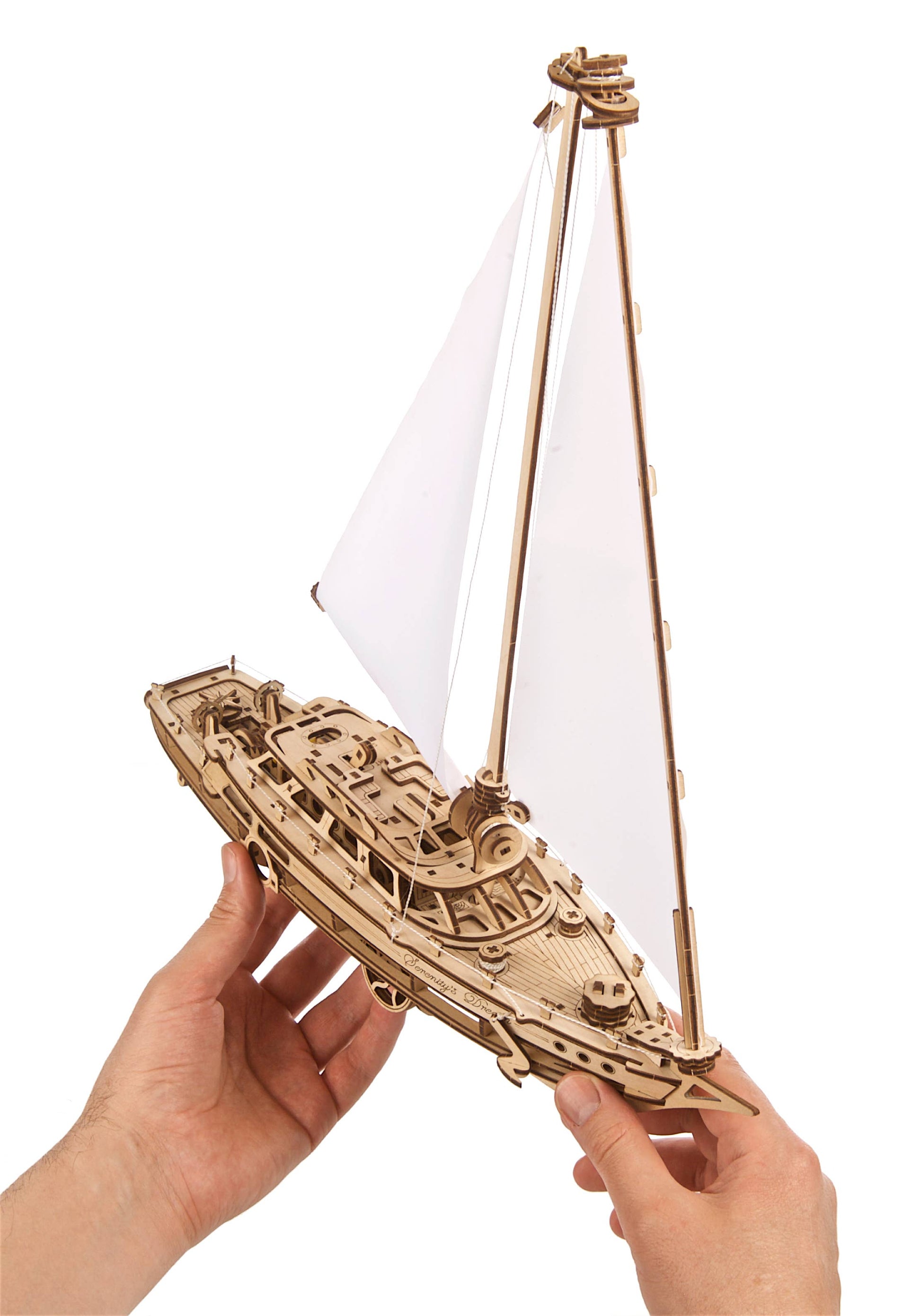 Assemble me. Build your own seafaring masterpiece! Serenity's Dream joins the Ocean Beauty Yacht and the Trimaran Merihobus in Ugears' fleet of DIY model sailing vessels, however, unlike those static models, Serenity's Dream is a spring-powered wind-up craft able to execute a series of tacking maneuvers for up to 4m across a flat surface. To operate, set the Start/Stop switch, located on the roof of the cabin, to the "Stop" position. Remove the winding key from the foredeck, insert it into the ratchet mechanism located on the starboard hull and give several twists. Replace the winding key in the deck, place the boat on a flat surface, flip the Start/Stop switch to the "Start" position, and watch as your yacht sails off, executing a set of graceful, zig-zagging tacking maneuvers.