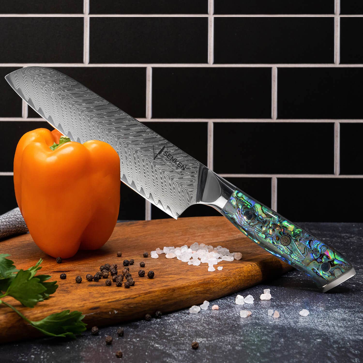 Breathtaking Japanese Damascus Santoku Knife Knife with real Deep-Sea Abalone Shell Handle. The 'Umi' 7" Santoku Knife is individually forged from 67-Layer Damascus Steel with a HRC Rating of 62 for unparalleled hardiness and performance. 33-layers of Damascus on each side surround the Japanese VG10 Steel Core. Built to last and retain sharpness so that you will never need another set chef's knife again. The Santoku Knife features integrated full-tang molding from blade to handle, which allows for increased force and leverage, making the knife useful against even the toughest of meats and vegetables. The handle is perhaps our most unique and stunning handle design yet; it's a Real Deep-Sea Abalone Shell handle that is full of color and will glisten beautifully in your kitchen. The handle is also completely waterproof, heat resistant, and non-slip, so it will feel absolutely wonderful in your hand. Assembled in USA.